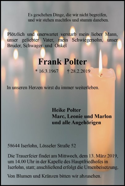 Unser aufrichtiges Beileid zum Tod von Frank.